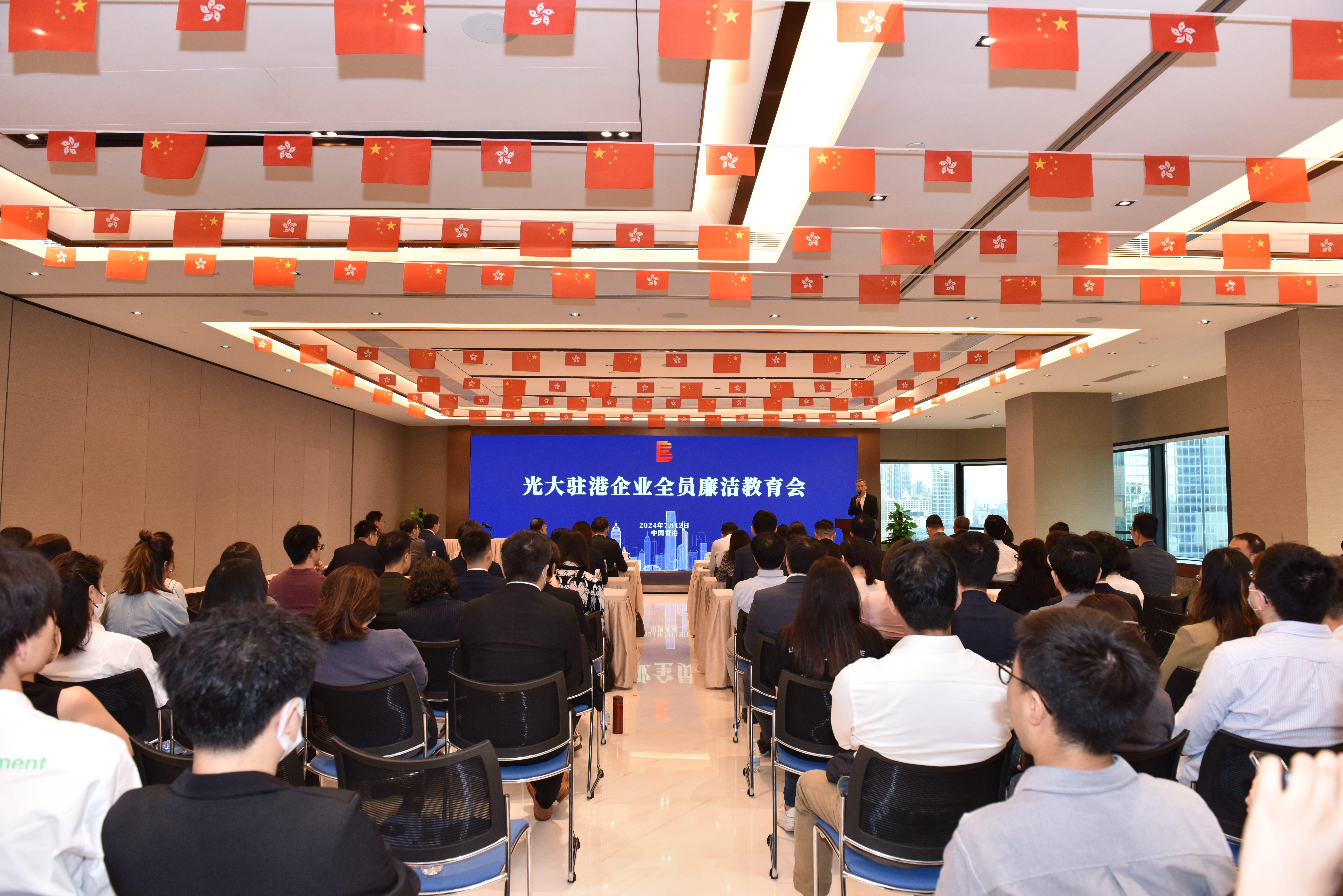 為增強光大駐港企業員工廉潔意識,推動企業廉潔文化建設, 7月12日,光大香港在香港光大中心舉辦了光大集團駐港企業全員廉潔教育大會。這是近年來光大駐港企業開展的最大規模專題廉潔教育活動。香港廉政公署社區關系處首席廉政教育主任黃小欣、防止貪污處總防貪主任葉錦峰做廉潔教育宣講,光大集團領導、光大香港董事長于法昌參會并提出工作要求。